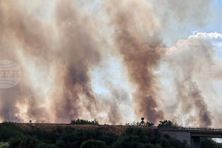 Както БТА съобщи, пожарът е тръгнал от автомобил на автомагистрала „Тракия“. Колата е била угасена, но са пламнали сухи треви, а огънят се е разгорял поради силния вятър. Не е спирано движението по магистралата.