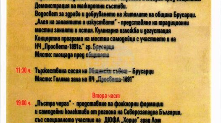 По-късно тази вечер в Брусарци предстои празничен концерт с участието на народния изпълнител Дани Моллов и оркестър „Мусти бенд“ от Велинград, на фолк изпълнителката Екстра Нина и на състави за изворен и обработен фолклор от общината и от област Монтана. Утре вечер празникът продължава с концерт на сръбския изпълнител Емир Джулович и тържествена заря.