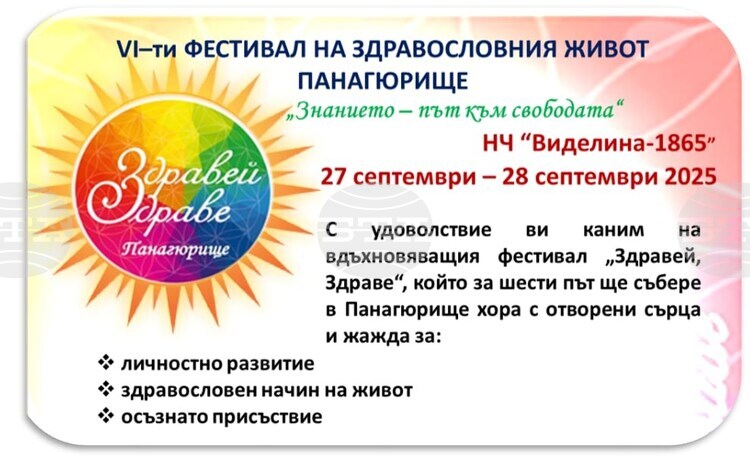 Шестото издание на фестивала на здравословния начин на живот „Здравей, Здраве!“ започва днес в Панагюрище и ще продължи до утре. Това съобщи за БТА Елена Дундарова от инициативната група. Събитието се провежда в Народно читалище „Виделина – 1865“, а Община Панагюрище е партньор на събитието, което е част от културния календар на общината. Тазгодишното издание е под надслов „Знанието – път към свободата“.