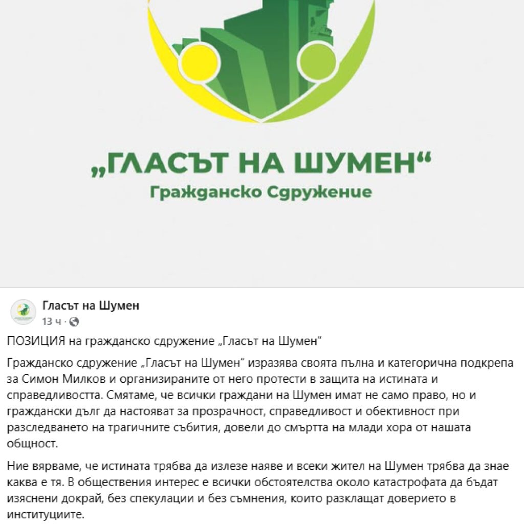 „Гражданско сдружение „Гласът на Шумен“ изразява своята пълна и категорична подкрепа за Симон Милков и организираните от него протести в защита на истината и справедливостта. Смятаме, че всички граждани на Шумен имат не само право, но и граждански дълг да настояват за прозрачност, справедливост и обективност при разследването на трагичните събития, довели до смъртта на млади хора от нашата общност.